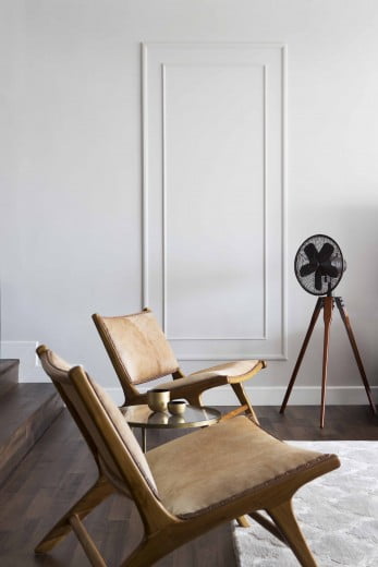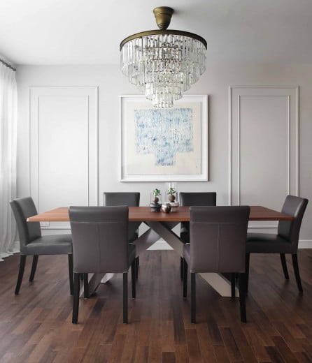 Walnut flooring, craft wood table, artistic fan, and brass-framed living room furniture, combined with the regal wall molding and chandelier provide a classic touch.